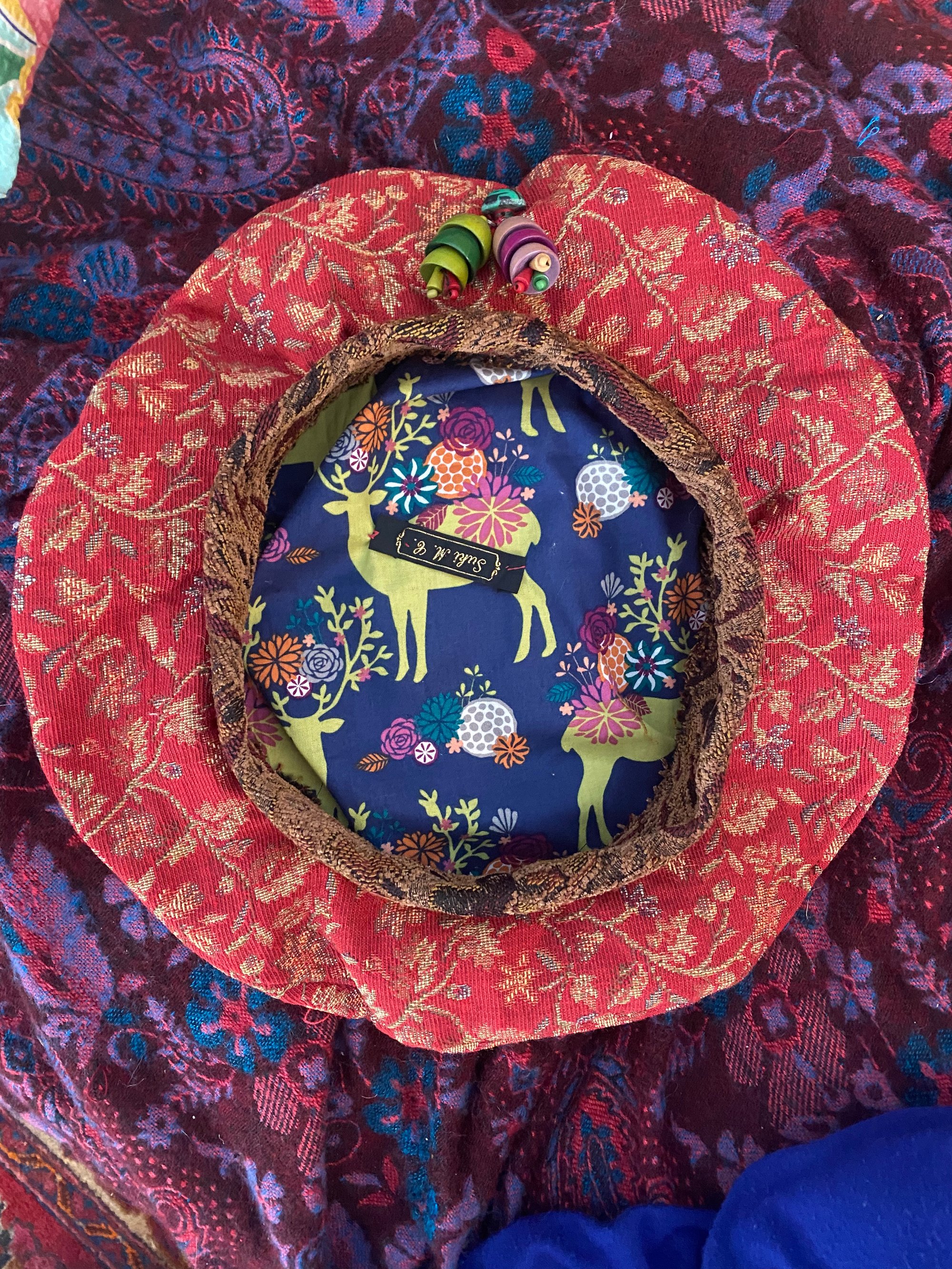 This handmade beret is made from vintage brocade fabrics and an adorable deer and flowers lining and embellished with vintage buttons .