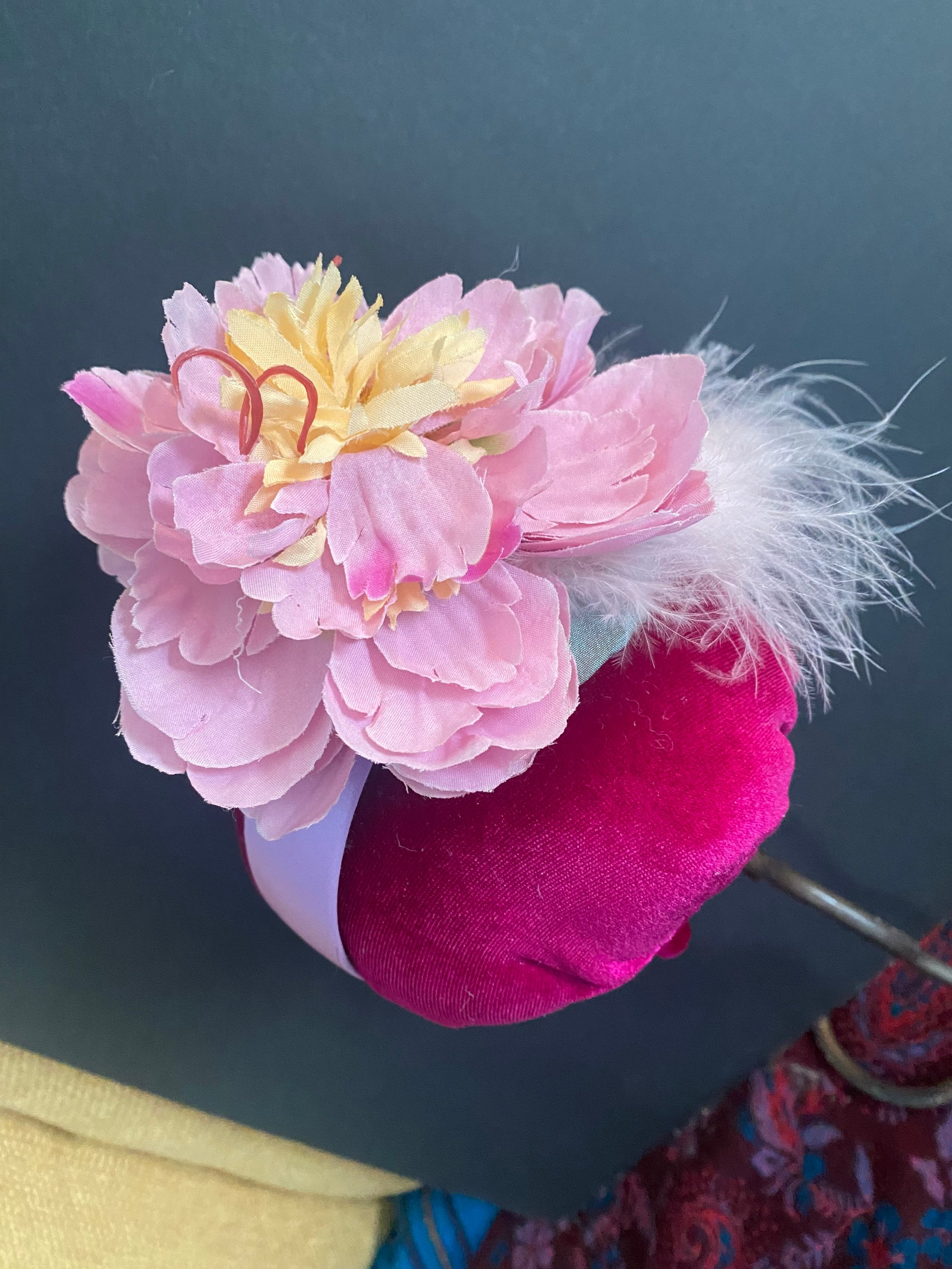 A fun easy to wear fascinator with feathers and flowers on a wide satin covered band that stays on the head without fuss and makes you look fabulously ready for a glass of bubbly and a dance !