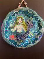 A hooked wool and needlefelted wallhanging in a circle 15x15 inches mounted on felted back of a lovely mermaid . Perfect for your favorite mermaids room 🧜🏽♀️