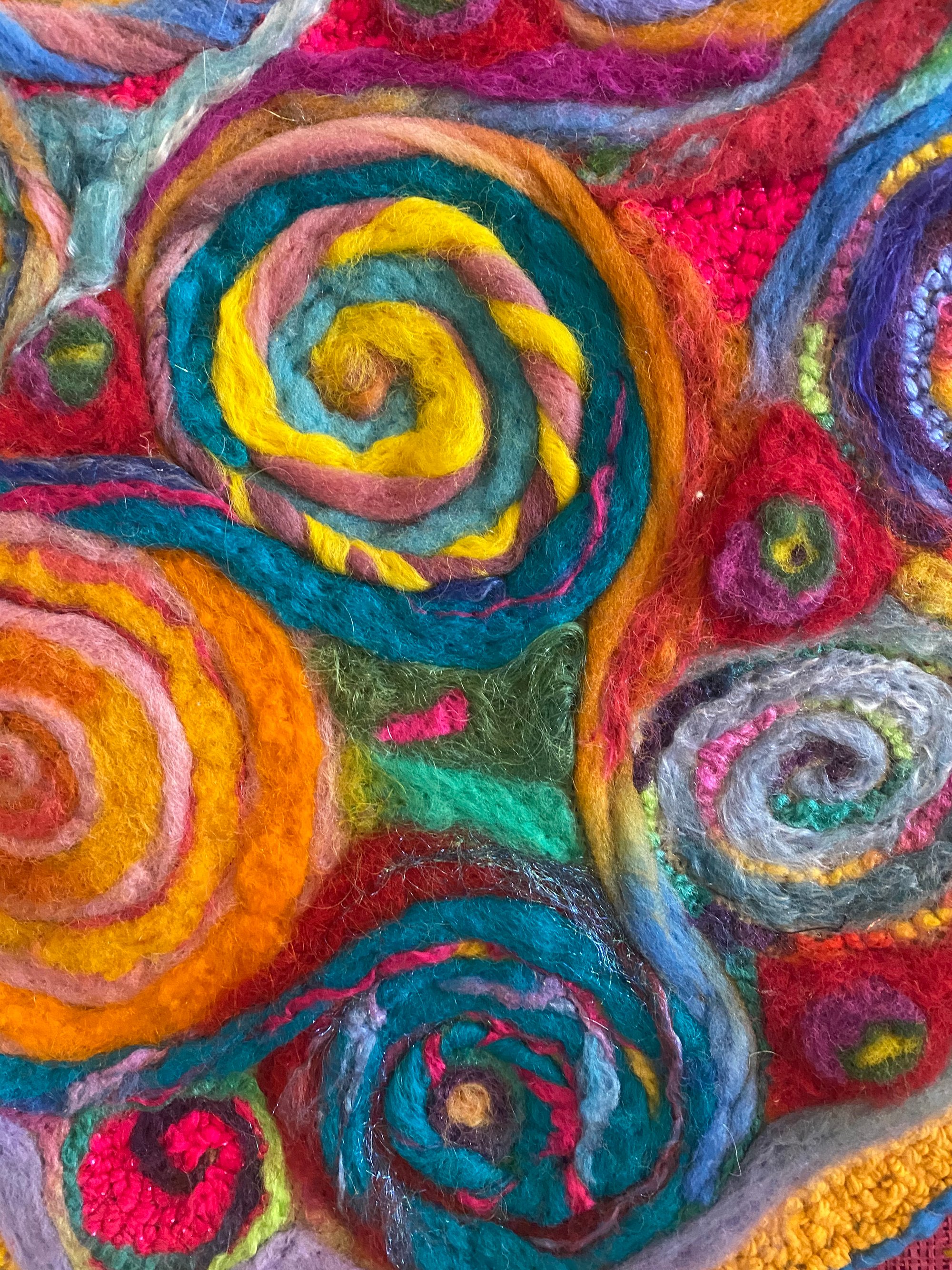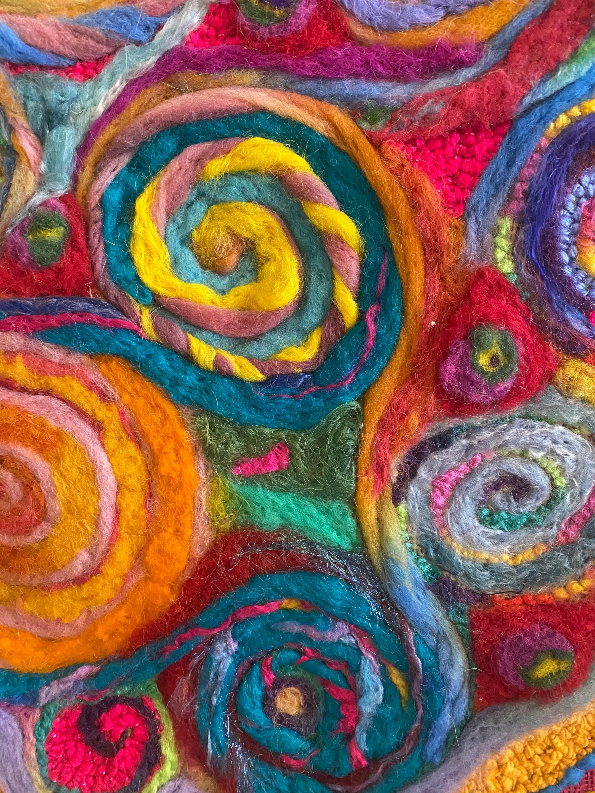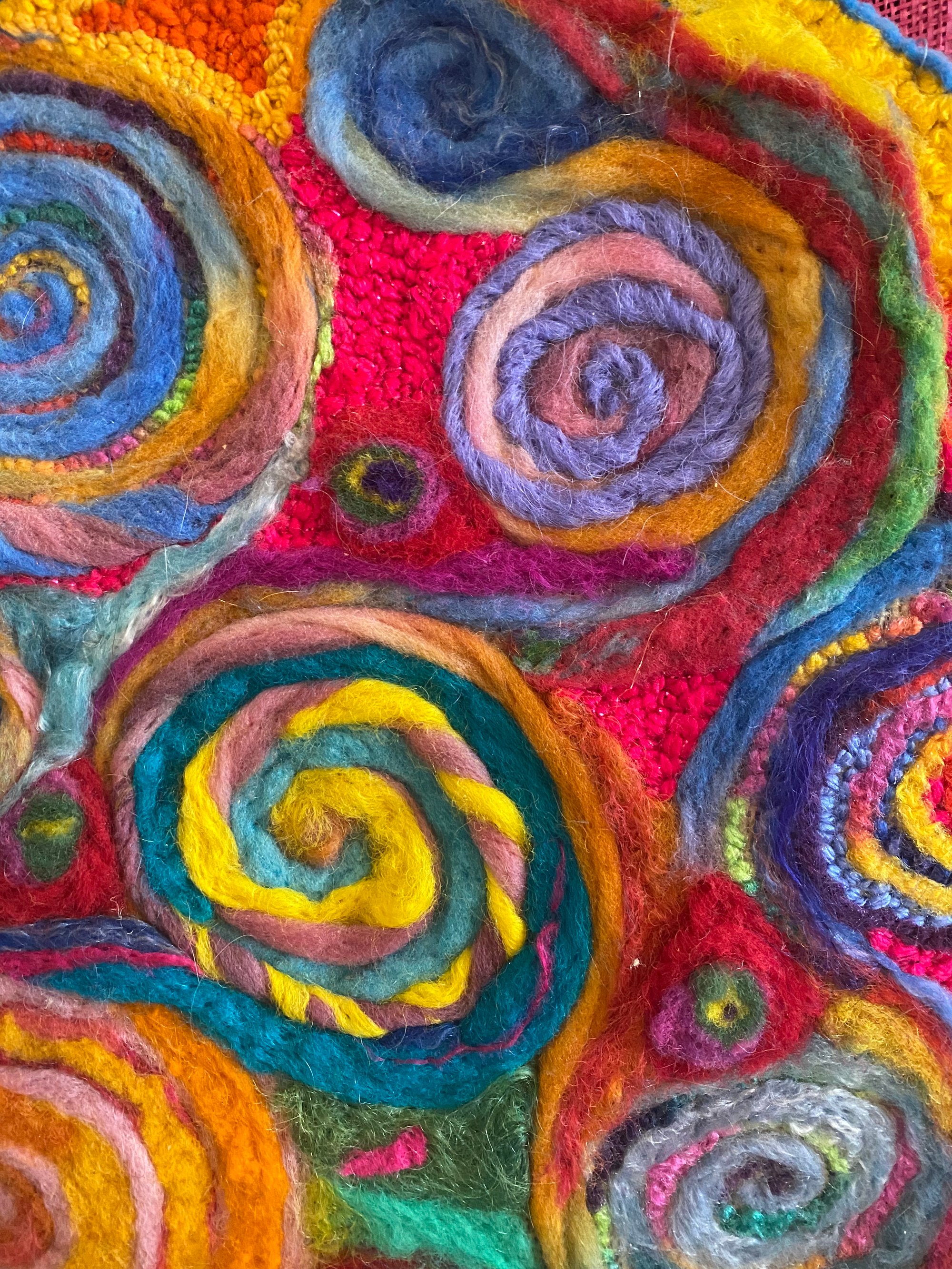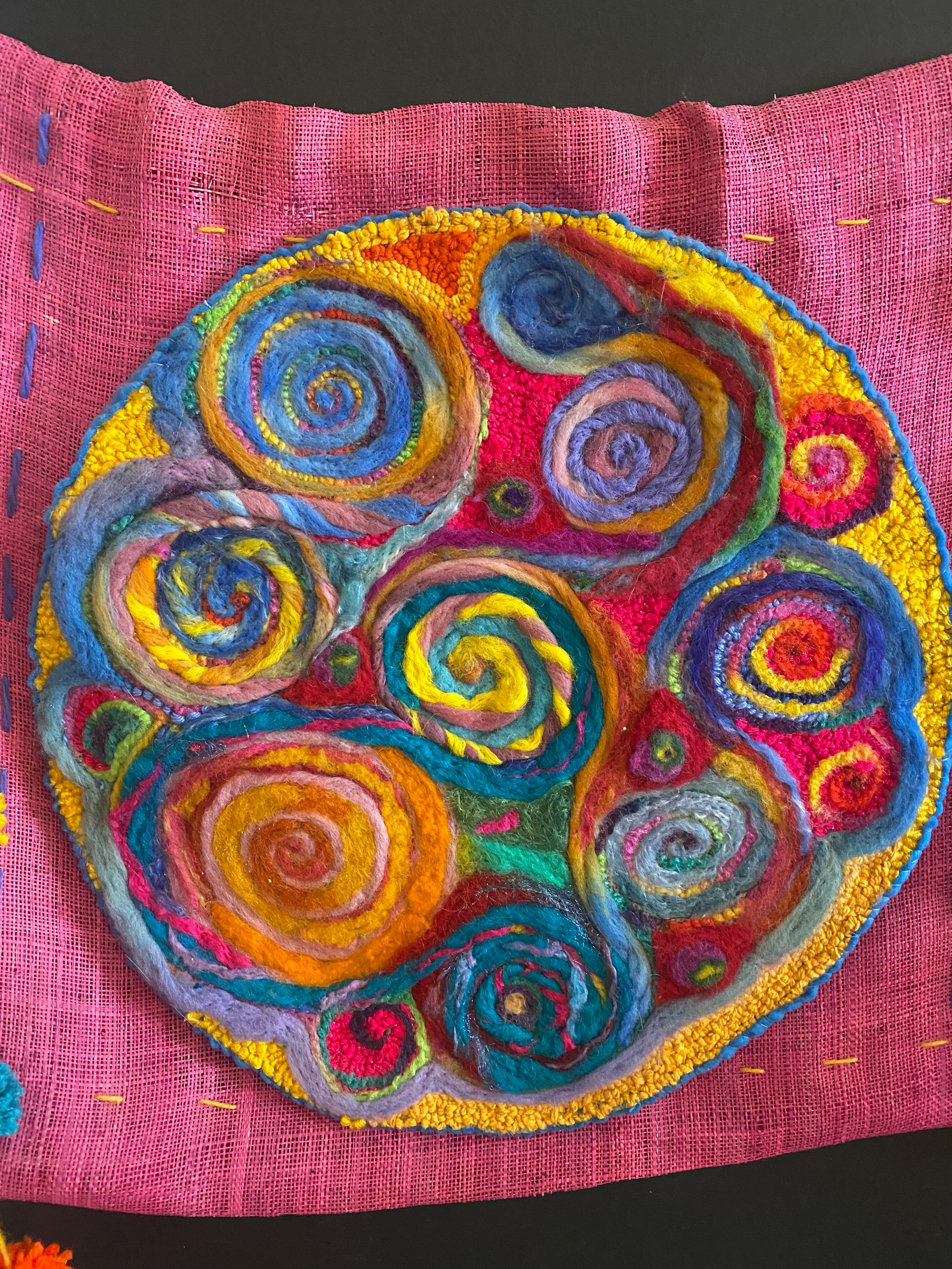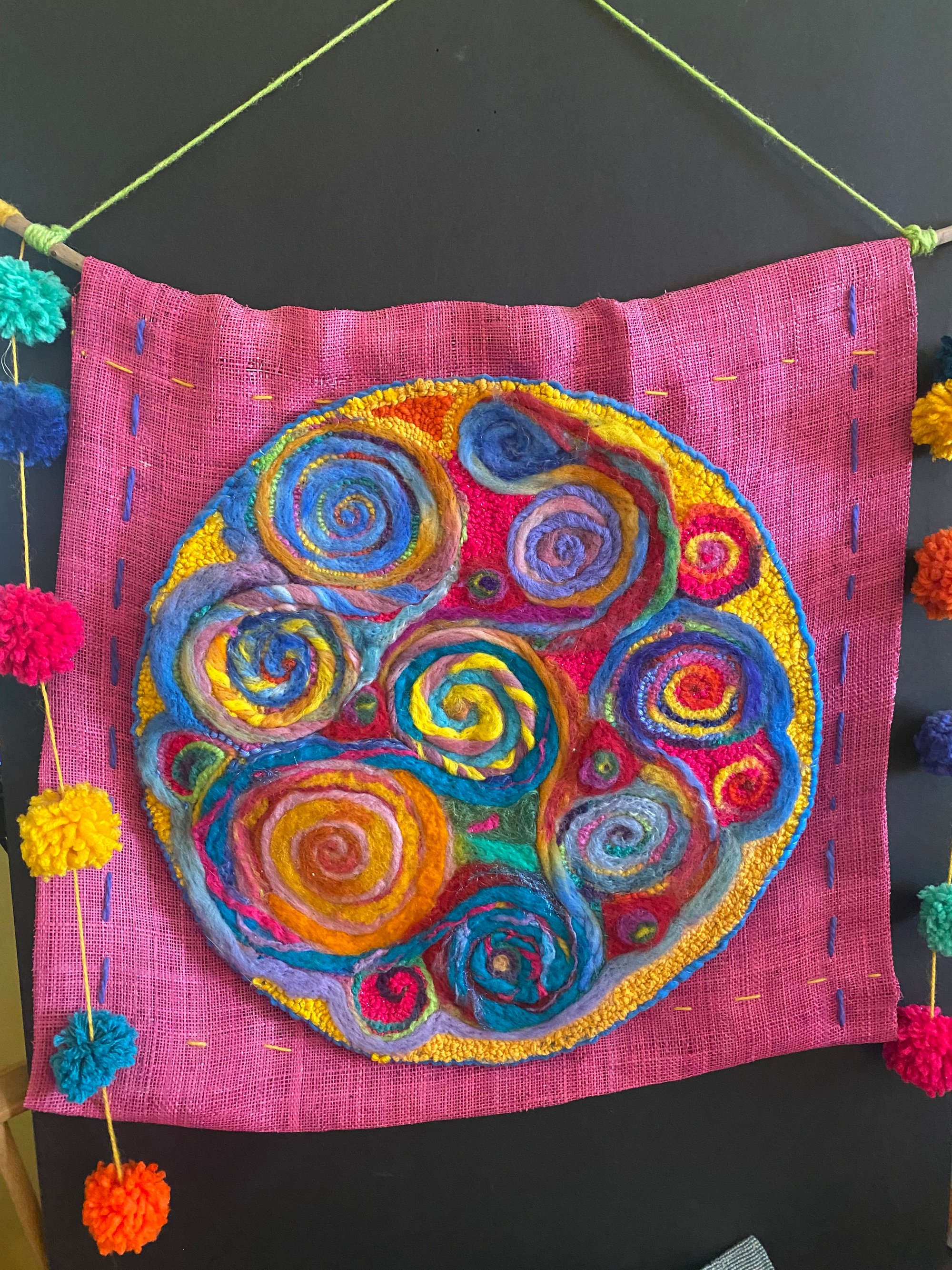 The colors of the Riviera Nayarit the gorgeous Pacific coastline in Mexico just north of Puerto Vallarta this piece was inspired after a wonderful trip there . 17x17 punch needle and needle felted on a pink burlap base and handmade Pom poms for each side hung on driftwood.